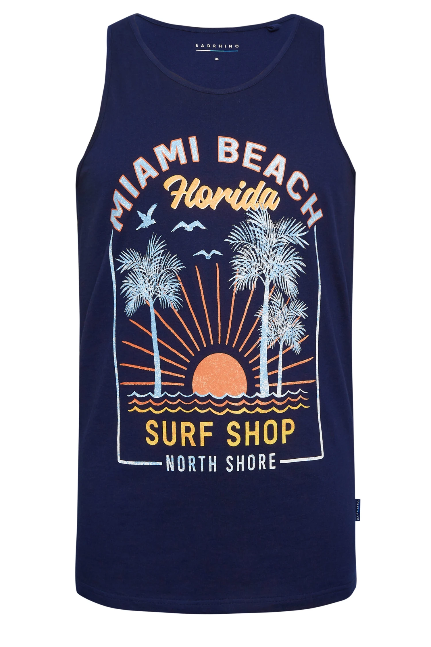 Add this badrhino vest top into your casual collection this season. Made from a soft cotton fabric, it features a sleeveless design with a scoop neckline and a ‘Miami beach’ print. Team with shorts and trainers for a casual summer look.