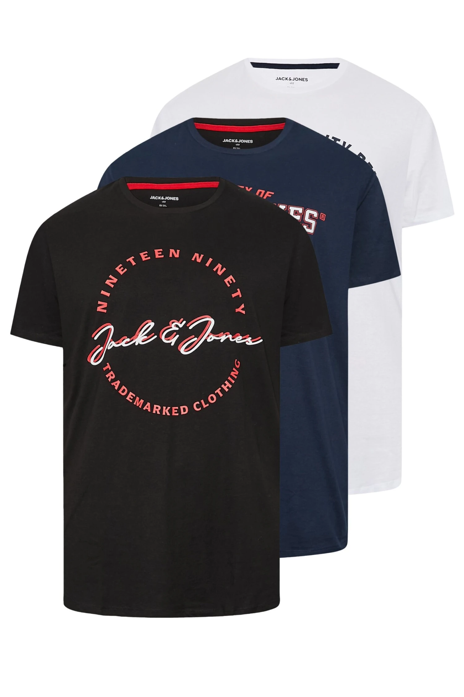 Update your wardrobe with this 3 pack of Jack & Jones t-shirts. Made from 100% cotton, they feature short sleeves, a crew neckline and a printed logo design in colours black, white and navy blue. Pair with jeans and trainers for a casual look for the weekend.