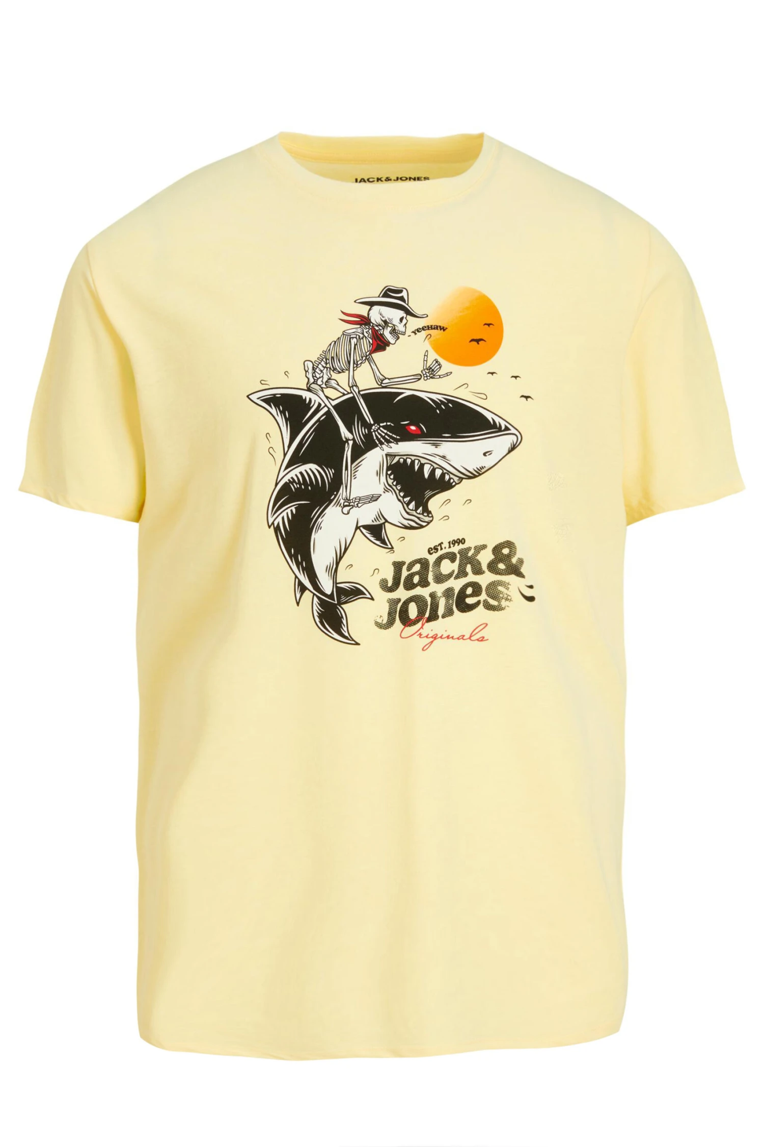 A new-in Jack & Jones tee for everyday wear. Constructed from a soft cotton blend, this t-shirt features short sleeves and a crew neck with a shark print design. Wear with shorts and trainers for a casual weekend look.